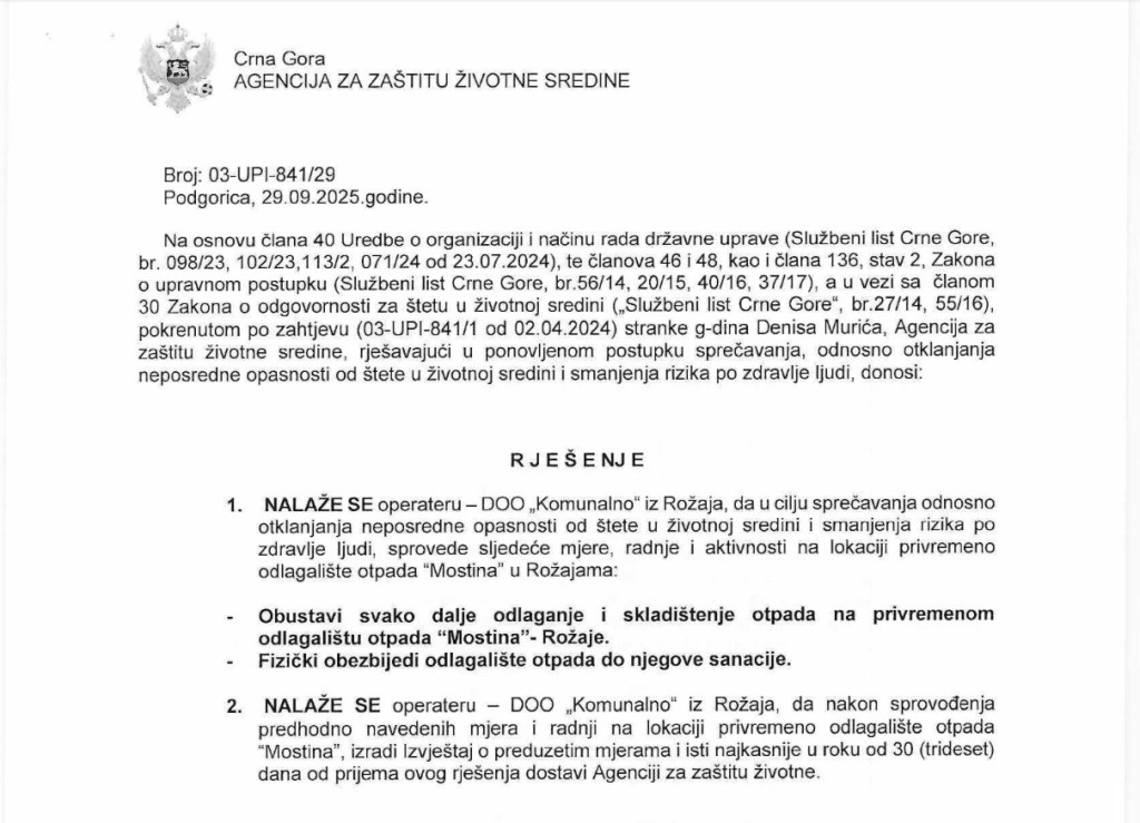 NVO „Promjene“ obavještava javnost da je Agencija za zaštitu životne sredine Crne Gore donijela rješenje broj 03-UPI-841/29 od 29.09.2025. godine, kojim se nalaže hitna obustava daljeg odlaganja i skladištenja otpada na privremenom, odnosno nelegalnom odlagalištu otpada „Mostina“ u Rožajama.